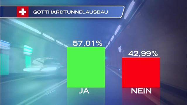 WiedergabelisteAmmann übernimmt Regierungsratssitz8 MinAbfuhr für DSI3 Min2. Gotthardröhre erwünscht1 MinAbstimmungs-Krimi bei Heiratsstrafe1 MinResultate der bernischen Abstimmungen2 MinResultate der solothurnischen Abstimmungen1 MinSwiss News2 MinUnentschieden zwischen FC Thun und FC Basel1 Min2. Gotthardröhre erwünschtDie zweite Gotthardröhre kann gebaut werden: 57 Prozent sagten «Ja» zur Vorlage und 43 Prozent lehnten sie ab.